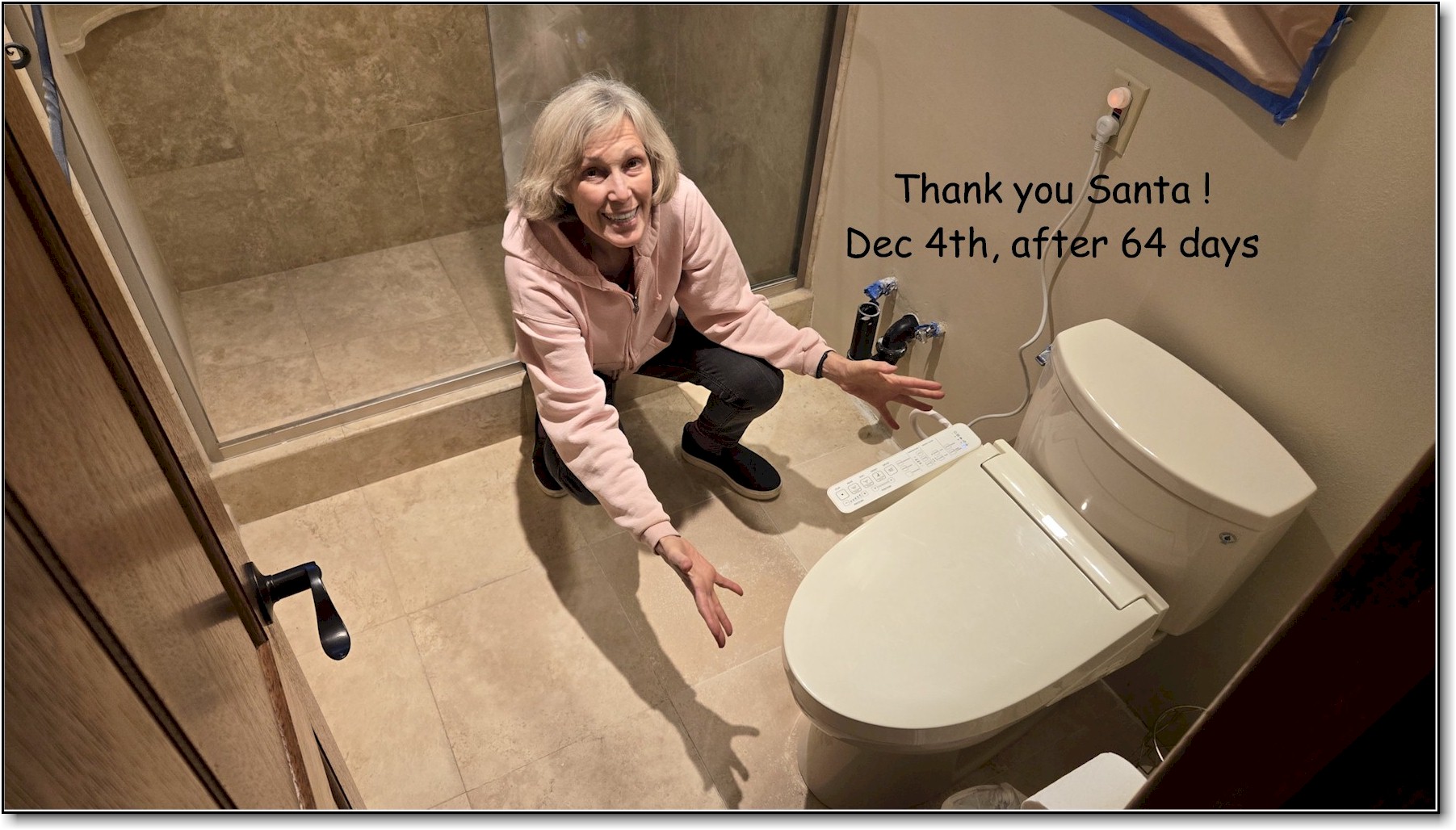 If Santa is listening: all we want for Christmas is a flushing toilet in the front house. Fortunately, we have a spare in the back building but, at 3 am? (click image) |