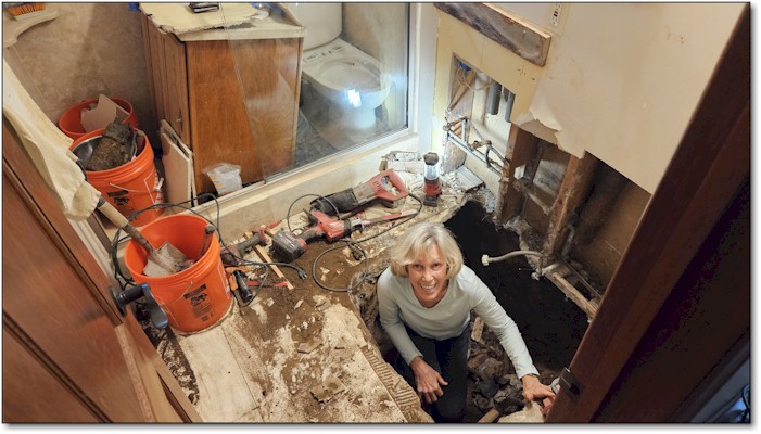 Now, for the not-so-glamorous part of the year: "Plumbing Hell"! Our 65 year old sewer line needed replacing. The project began on September 29th and is finally nearing the finish line. It required excavation inside our bathroom—never a sentence you want to say out loud—to replace the old cast iron pipes. |